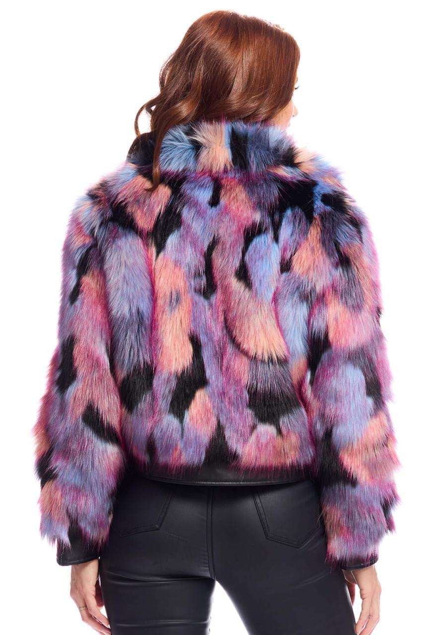 Our Cosmo Fox Zip Jacket, true to its name, brings beautiful order to chaos by melding color, texture and shapes. Tamed by the structured elements of a traditional bomber, the Cosmo Fox Zip Jacket is a cool mix of Blues, Greens, Yellows and Pink. Splashes of Black give cohesion to this incredibly soft, lush fur with a fluid, liquid hand. The Cosmo Fox is further tamed by Black vegan leather outlining the center front zipper, sleeve edges and hem. A zipper extending to the upper edge of the collar provides the option of an open neck or cozy standup collar. Versatile and wearable, the 21" Cosmo Fox Zip Jacket has the added bonus of easy-care machine wash/line dry. Wear it over all Black and project a cool cosmic vibe with warm contemporary style.