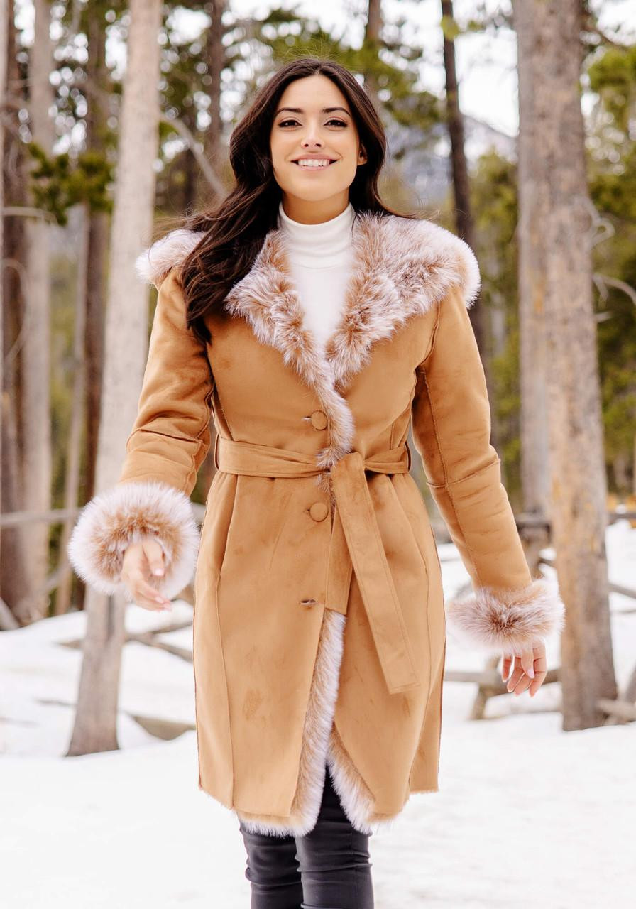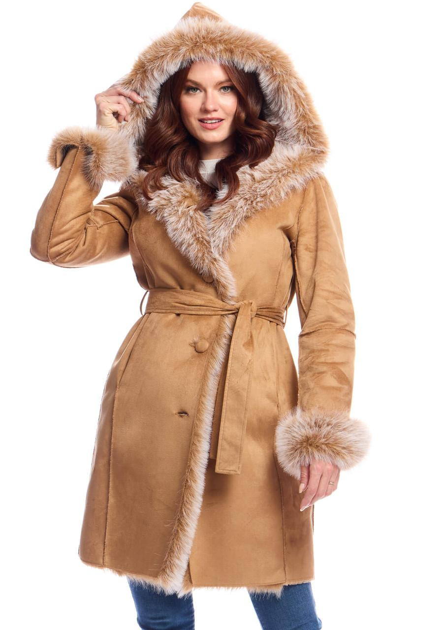 The coat you thought resided only in your dreams? It's the Sundown Suede Belted coat! With rich Toffee vegan suede outside and a lush lightly-tipped Espresso Fox lining inside, this 38" stroller is dream-worthy. Better still, we engineered away the bulk, leaving the luxe and luscious aspects, for a smooth compact fit. The generous fur-lined hood transitions into an oversize collar and the fur spill along the center front adds flattering verticality. Princess seams -- seven total -- ensure a sleek, body-skimming silhouette and suede-covered buttons maintain a clean, contemporary look. The tie belt can be tied in front or tied casually knotted in back. Rollup fur cuffs adjust to a custom length and the knee-length makes it ideal for walking. Fabulously flattering and wonderously warm, the Sundown Suede has the dreamy bonus of easy-care machine wash/line dry.