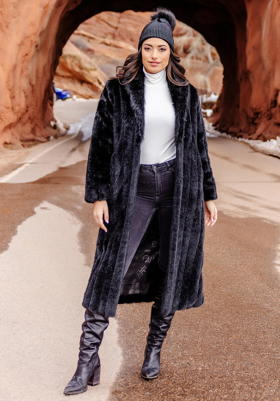 Feel fabulous wrapped in this sumptuous 48"-long full-length Black Mink faux fur coat. Impeccably styled with classic details, the convertible collar can be worn up as a standup collar or down as a shawl collar. Flawlessly crafted in our workroom, we incorporate hidden velvet pockets, a satin-faced hem and fur hooks. Made in USA & imported.