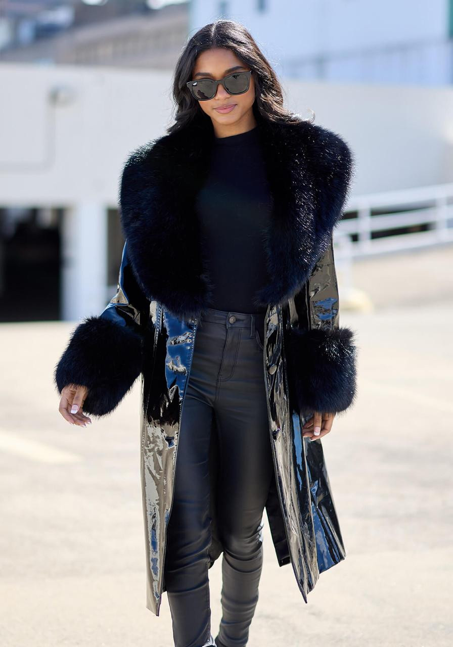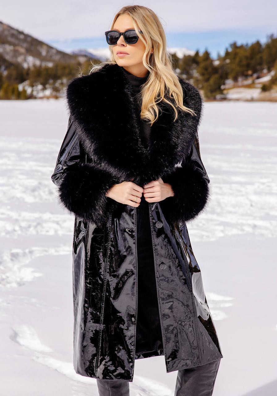 The Girl Crush Maxi Coat in Black? Hum the melody . . .I got a girl crush. I hate to admit it, but I got a heart rush. Our sentiments exactly! Beginning with the shiny Black patent body and the thrill of rich Black Fox collar and cuffs! It ain't slowing down. I got it real bad. Want everything she has. It's the coat that beckons to be tried on, just to experience the fabulous-ness of sleek patent juxtaposed with lush, luxe fur. Princess seams shape the waist and ensure a body-skimming silhouette. The oversize collar ends at the waist where three button closures begin. If your heart beats faster just reading about the 43" Girl Crush Maxi coat, wait till you look 4" taller and 10 pounds lighter! Sing with me: I got a heart rush. It ain't slowin' down.