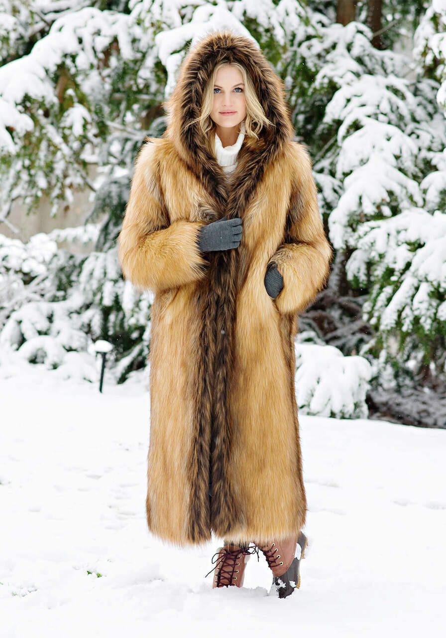 Slip into the dramatic elegance of a full-length Red Fox coat and revel in the luxury of the lush, plush feel of the World's finest faux fur! A visually graphic feast of color, texture and toning, Red Fox is a celebration of warm Coppers and Rusts, softened by Tawny Tans and Brown and further enhanced with delicate Ivory and Tan tipping. A subtle vertical pattern gives this luxe, lush, highly-authentic fur the illusion of flattering length. Amazing to look at, but even better to wear, you'll fall in love with the fluid, flowing hand and whisper-soft touch of Red Fox. Expect to stand a little taller and walk more confidently when your reflection provokes an audible gasp. From seriously-cozy velvet pockets and a sumptuous satin lining to substantial marbled toggles and a satin-faced hem, we craft into this coat every detail you'd expect in a $25,000 coat. The dramatic 48" full-length is perfect for urban adventures and black tie events, yet long enough to wear with boots and jeans for maximum coverage and warmth in the coldest weather. A face-framing hood blocks Arctic blasts as you welcome Winter with style. The most voluminous fur choice in this full-length, hooded style, Red Fox is for the fur-lover who dreams of being enveloped, head-to-toe, in a statement coat!