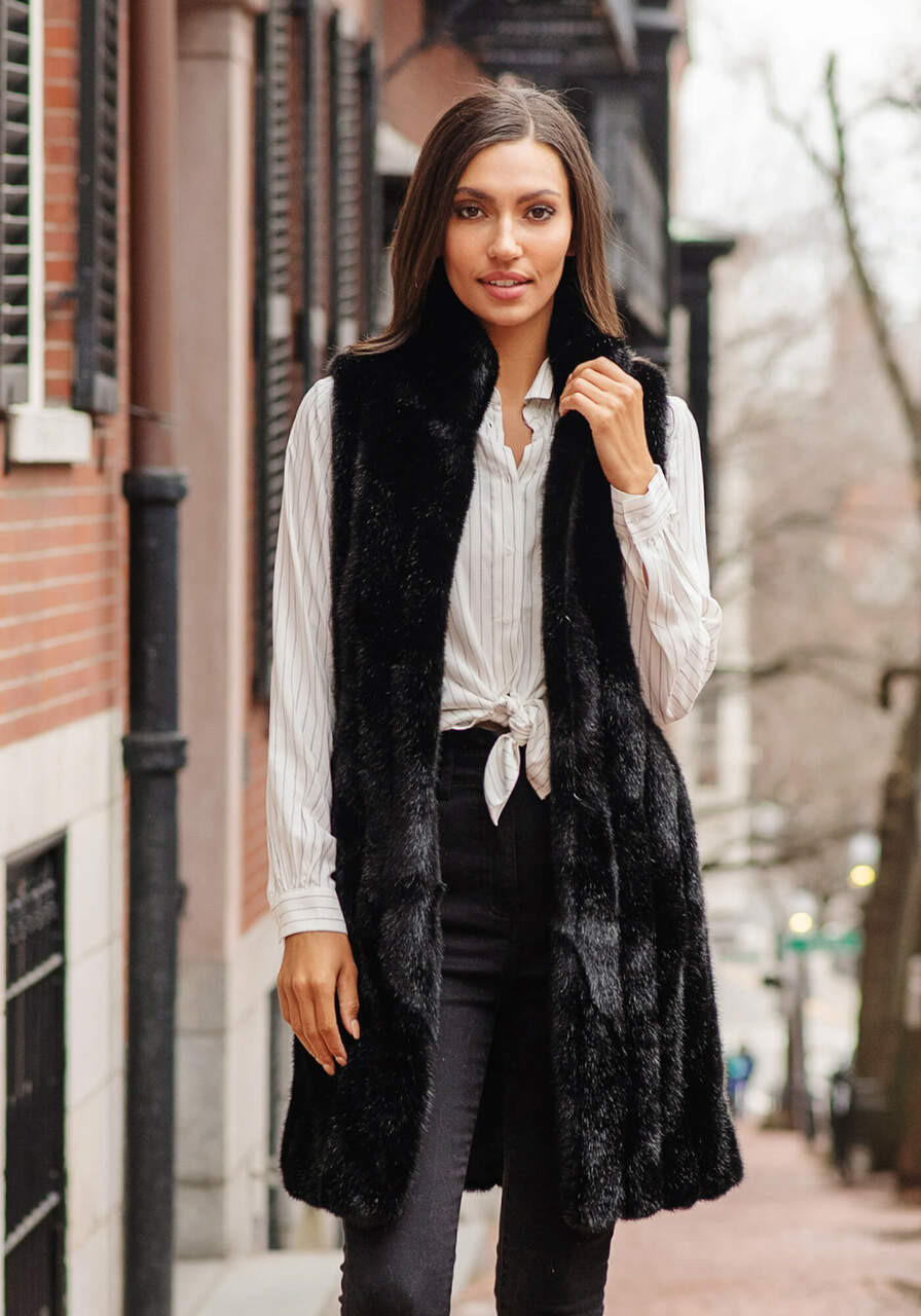 Escape to a fabulous Winter wonderland in our Black Mink Stroller Vest! In effortlessly chic Black Mink, you'll love this forever-flattering, timeless neutral that works well with everything in your wardrobe. Among our most authentically-beautiful furs, Black Mink has a sheen and touch nearly indistinguishable from animal fur. Possessing a lush, plush touch, subtle pelt lines spaced just two inches apart, add bulk-free verticality. Finished with a contoured standup collar, concealed velvet pockets and European hook closures, this classic 36" knee-length vest has a flattering, body-skimming cut. Now imagine being wrapped in a vest that's all about sleek, slender warmth. For brisk evening walks or hanging out next to a warm fireplace, the Black Mink Stroller Vest truly represents the best of faux fur!!