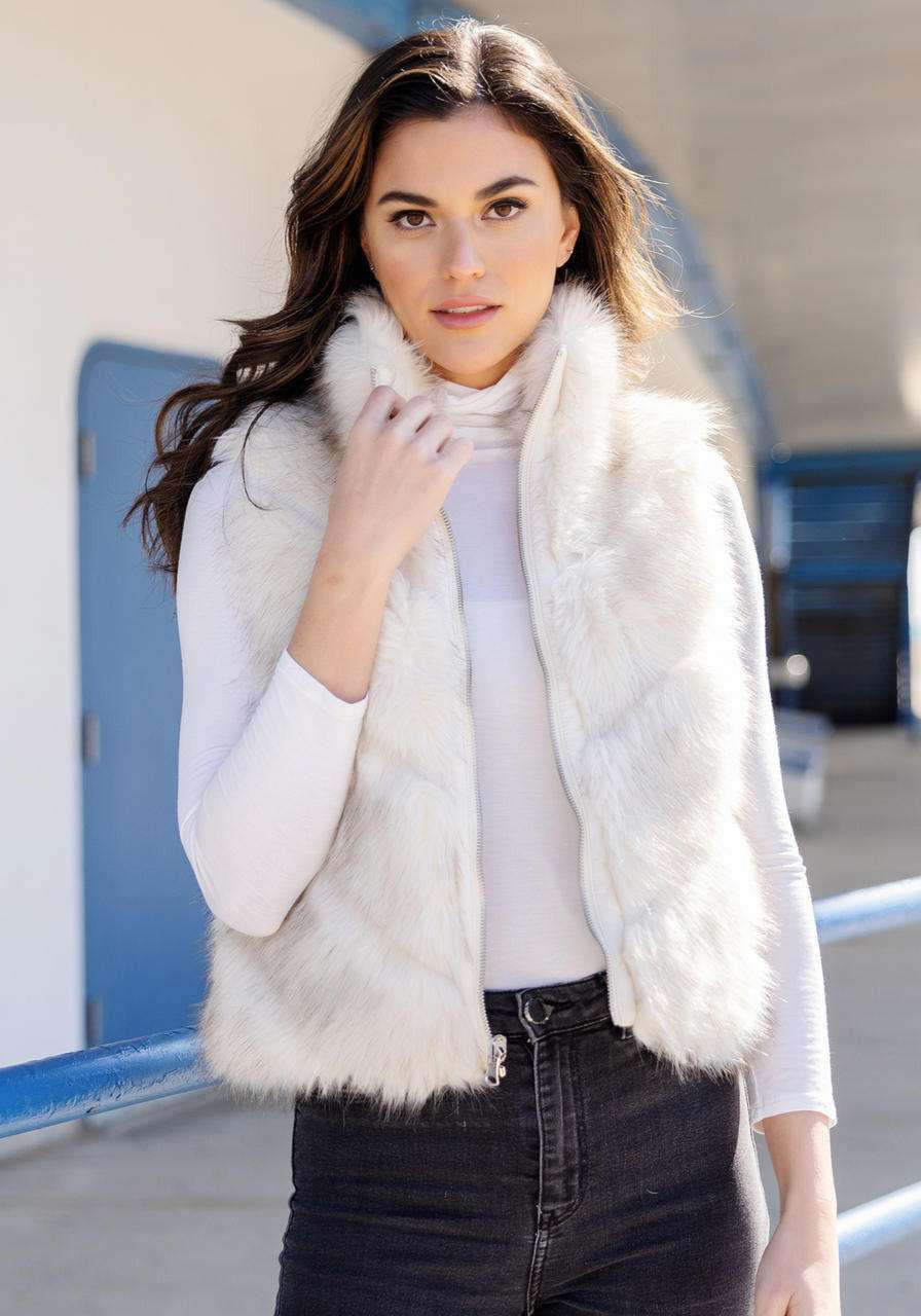 With versatility and style, the Reversible Chevron Shortie Vest has enough moxie to become your favorite fashion signature! With a warm Ivory undercoat and just-right brown tipping, this 21" reversible Mink vest is an engineering masterpiece! Diagonally-worked Mink chevrons, tamed by narrow velvety strips of Ivory, add texture and graphic detail, as well as eliminate any hint of bulk. The face-framing standup collar can be worn open or closed, chin-to-hem, thanks to a Silver zipper. For additional design interest, the all-weather side has topstitched chevrons and welt pockets. For a fluid, body-skimming silhouette, side seam pockets are concealed on the fur side. Ideal for travel and a busy schedule, the Reversible Shortie goes from a morning walk and coffee date to drinks and dinner at a fancy new restaurant. Now the dilemma: fur outside or inside?