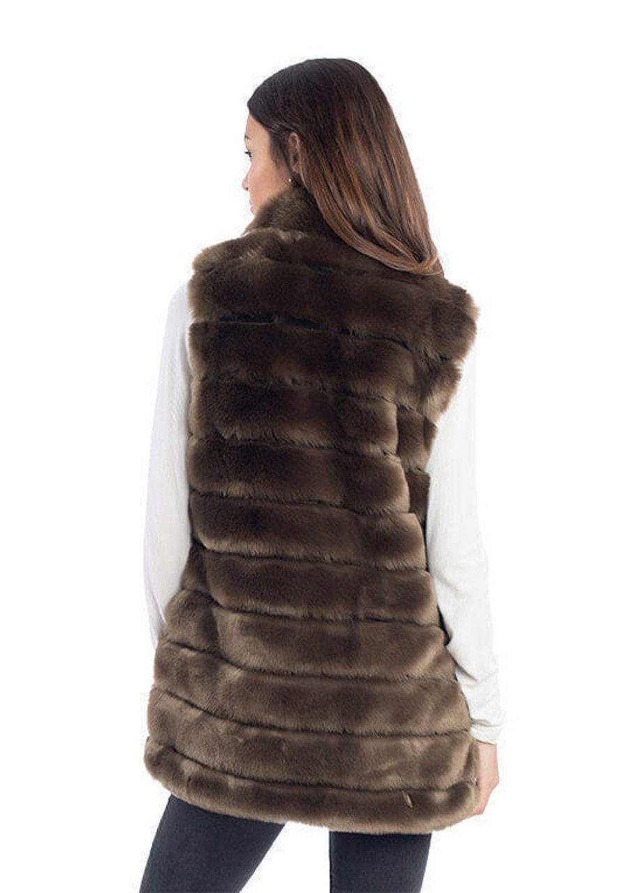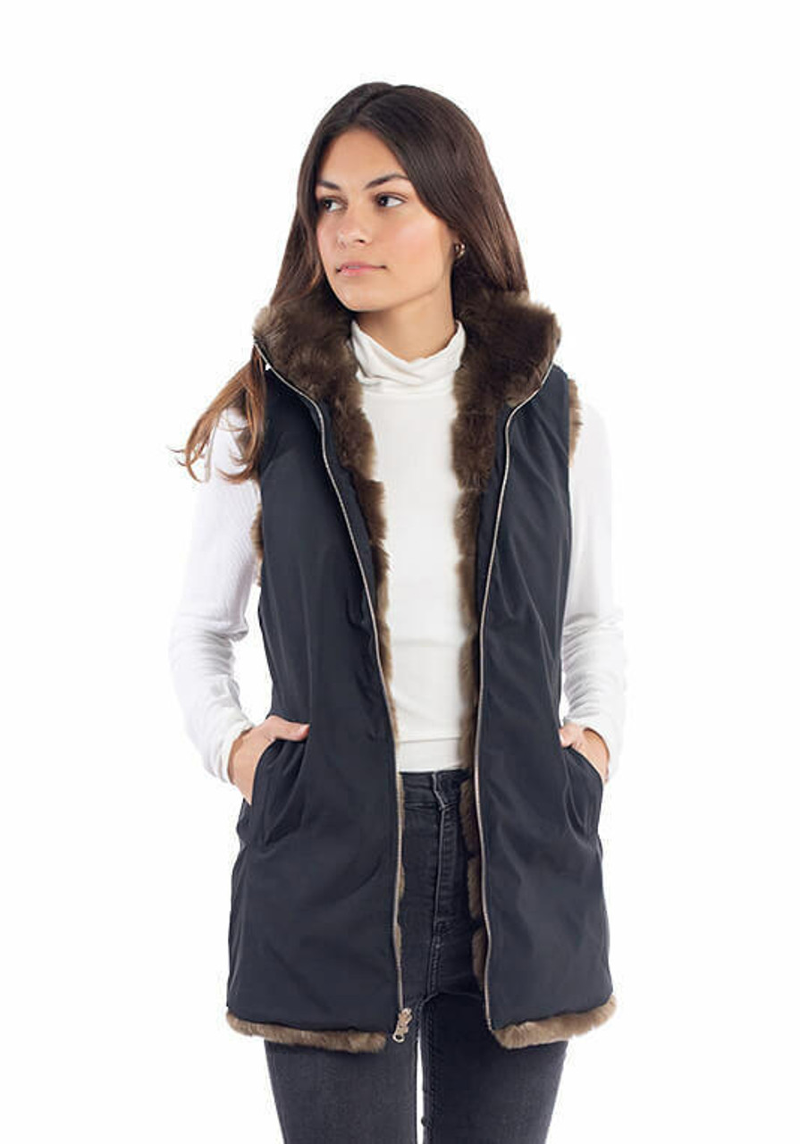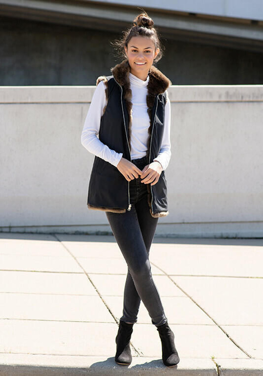 Over-achievers rejoice: our reversible zip vest is for you! Two beautiful 30" vests in one and equally detailed on both sides, the Black all-weather side has a standup collar and perfectly-tailored welt pockets. The dressier fur side shares the same standup collar--but of fur--and concealed pockets. Thanks to a fabric buffer, the Silver zip closure will never stick. Double-sided, the zipper extends to the collar edge and when open, reveals the face-framing fur collar. Great design aside, the rich Mocha Mink is super-soft with exceptional depth of color. For a quality look, we used a Black all-weather fabric with a fluid, supple hand and high-end matte finish. In true over-achiever spirit, our reversible zip vest has the added bonus of easy-care machine wash/line dry! The perfect travel companion, saving valuable luggage space, it's a vest that promises to be almost as amazing as you!