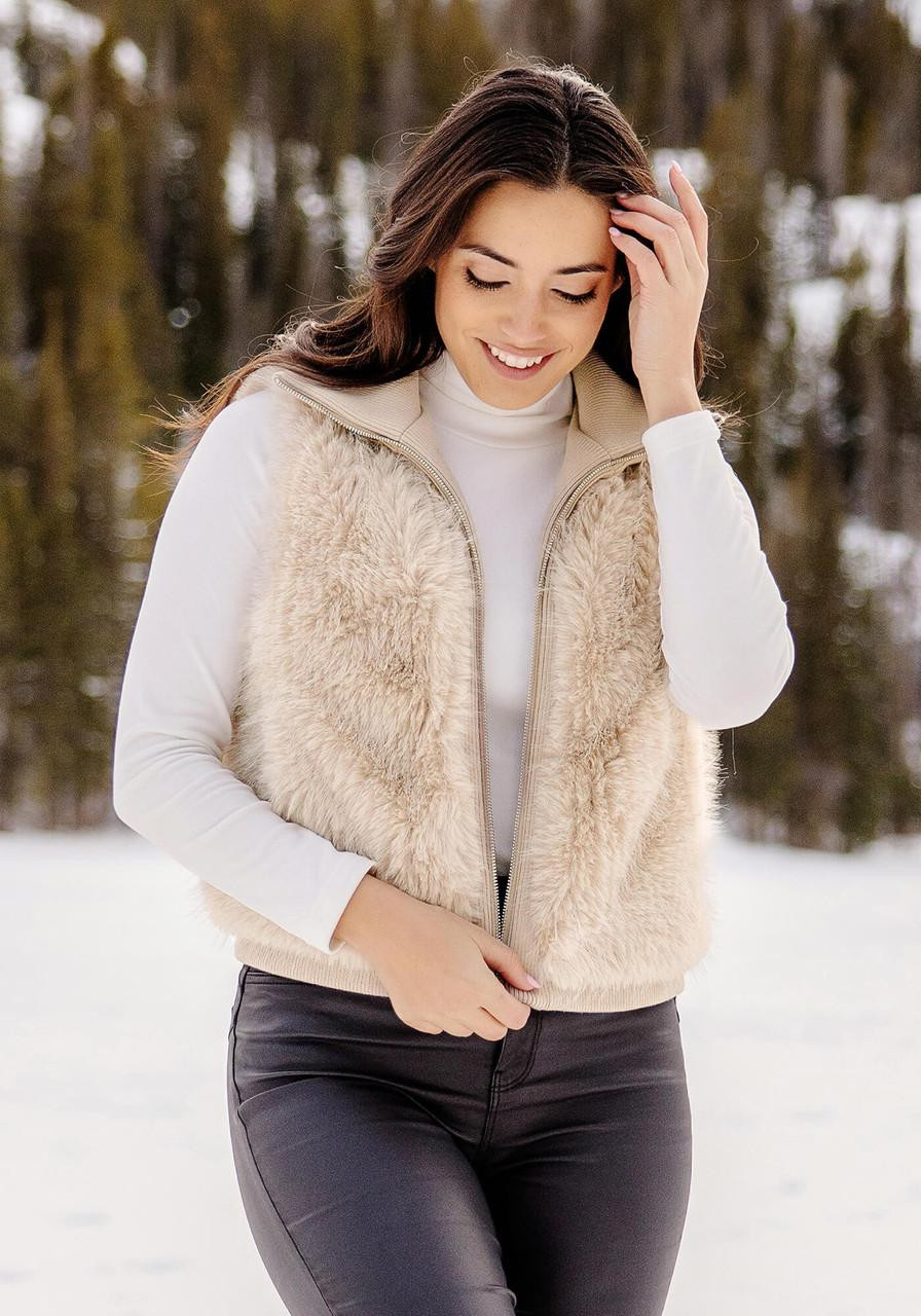 Elevate your look with the Parkside Zip Vest. With the look of hand-knit fur, in an intoxicating soft Champagne color, the Parkside Zip Vest is your ticket to understated style. Light yet compact, thanks to featherweight faux Fox yarn, the Parkside balances breathability with bulk-free warmth. A rib knit collar keeps it effortlessly casual. Repeated at the hem and center fronts, ribbing elongates and serves as zipper guards for no-stick performance. The zipper extends to the collar upper edge, allowing the collar to fully close or lie open and flat. Concealed pockets disappear in the lush fur and the inside is elegantly lined with satin. Practical as well, spills and mishaps disappear with easy-care machine wash/line dry.