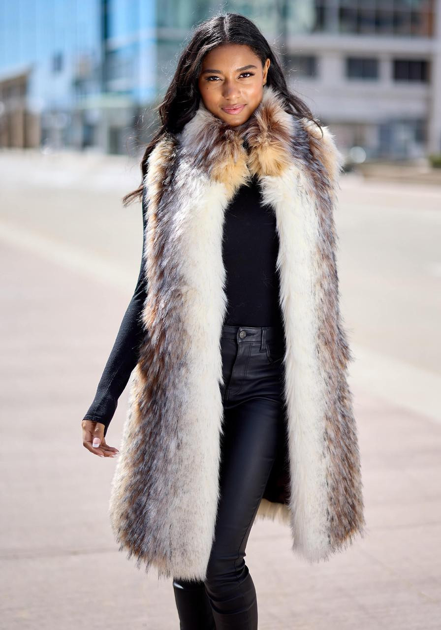 Escape to a fabulous Winter wonderland in our Arctic Wolf Stroller Vest! In soft, silky Arctic Wolf, this robust fur is a warm palette of Browns, Tans and Ivory. Richly tipped for authenticity, Arctic Wolf has a regal verticality, balancing the lush, plush pile. A timeless neutral sure to work well with many things in your wardrobe, Arctic Wolf is authentic in color, touch and appearance. Finished with a contoured standup collar, concealed velvet pockets and European hook closures, this classic 36" knee-length vest has a flattering, body-skimming cut. Now imagine being wrapped in a vest that's all about indulgent, cozy warmth. For brisk evening walks or hanging out next to a warm fireplace, the Arctic Wolf Stroller Vest truly represents the best of faux fur!