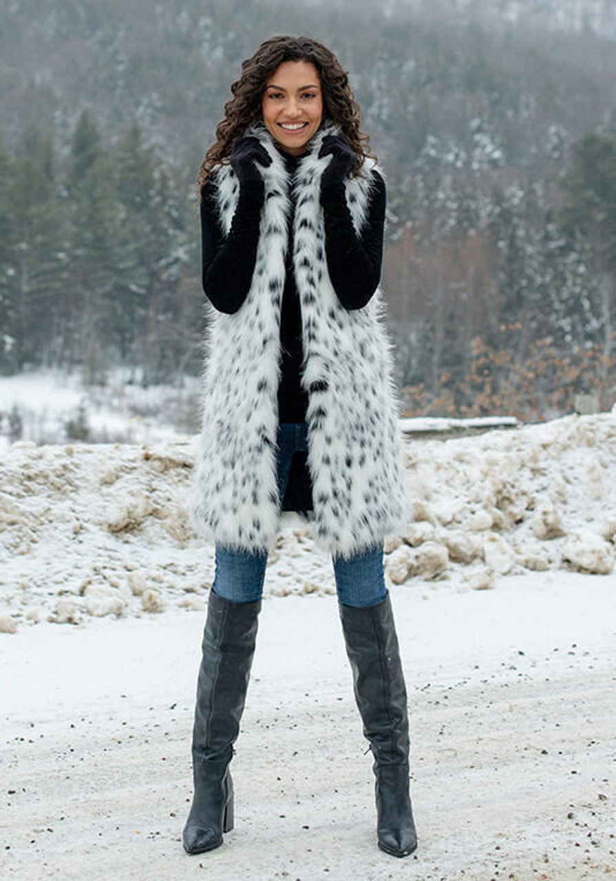 Invest in a desk-to-dinner Winter wardrobe staple: our Frosted Leopard vest! One of the most beautifully authentic furs we've encountered in nearly three decades of obsessing over faux fur, Frosted Leopard is a magic mix of pattern and texture. A sleek Ivory ground, spotted with a delicate Leopard pattern, is enhanced with an ethereal frosting of guard hairs. Possessing a soft, sensuous touch, with a fluid, liquid hand, the combination is perfection! Amazing to look at, but even better to wear, you'll love wearing this 36" stroller-length vest over a turtleneck and jeans OR dressy evening separates. Finished with a standup collar, concealed pockets and European hook closures, this Frosted Leopard vest is destined to become your favorite Winter wardrobe investment!
