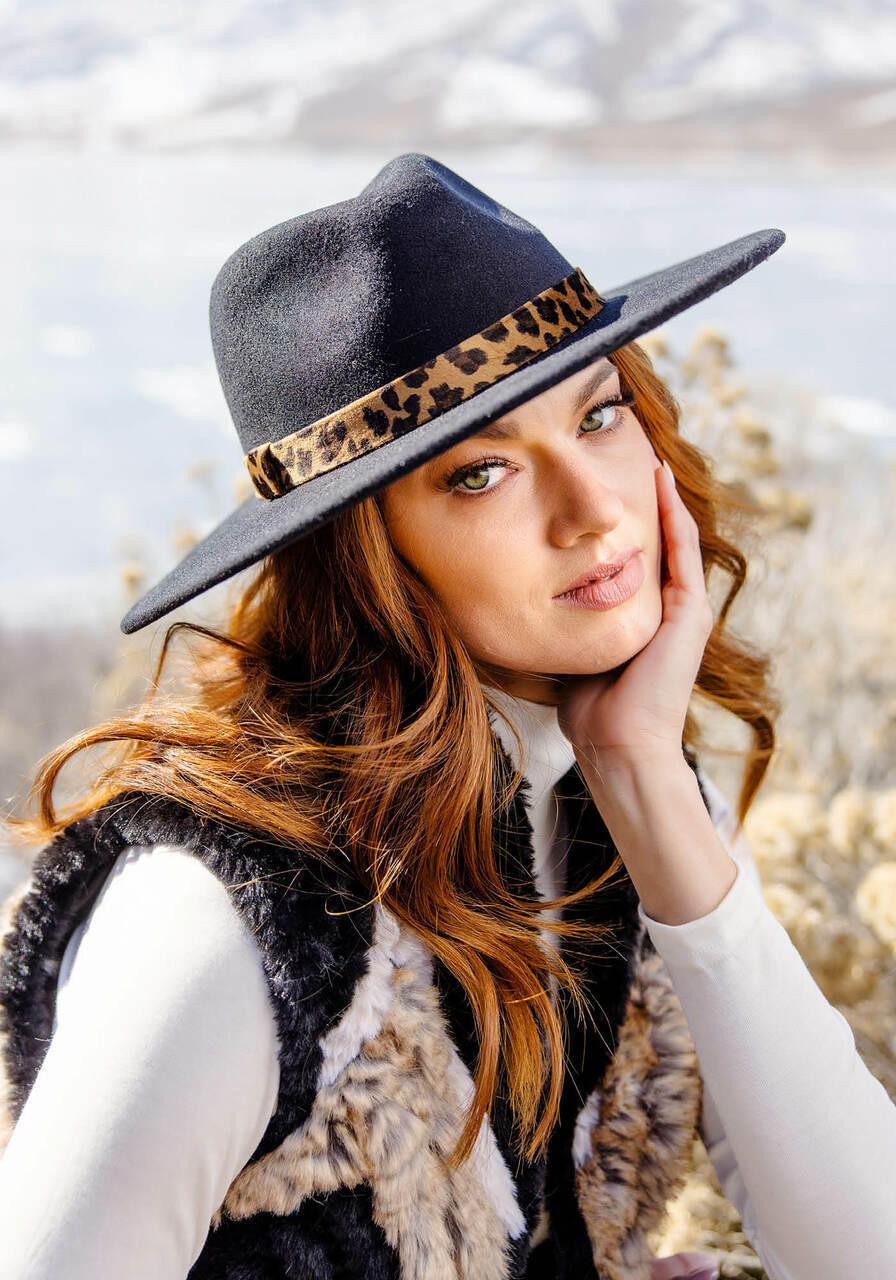 Dial up the drama with our Black Fedora! With a classic pinched crown and shaped to cast flattering shadows, the flat brim magically erases hints of late nights, too much fun and too little sleep. A velvety Taupe Leopard band, encircling the crown, adds design interest, texture and color. Concealed inside the 4½ crown, a ribbon tie ensures a custom fit. An effortless way to elevate the simplest separates, the Black Fedora easily updates a seasons-old coat or simply adds a touch of attitude on a bad-hair day. Edge-to-edge at its widest point, the brim diameter measures 15".