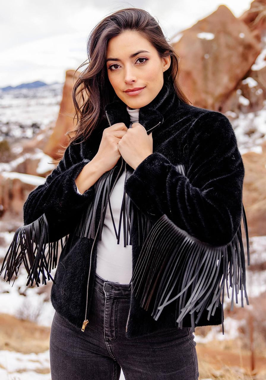 If Farrah Fawcett appeared at the Dutton Ranch, she'd be wearing our 23" Farrah Black Fringe Jacket. A classic that checks every box, super soft Black sheared Mink is just the beginning. Add swingy, fluid 6" fringe with lots of movement along front and back yoke seams, as well as sleeve backs. The face-framing standup convertible collar can be worn open or closed, thanks to a Gold zipper that extends to the collar edge. Concealed pockets disappear in the Black velvety pile. Farrah is finished with a satin lining. Over Black denim and boots or a tailored suede skirt, with Farrah along, your style credibility is secure for life.
