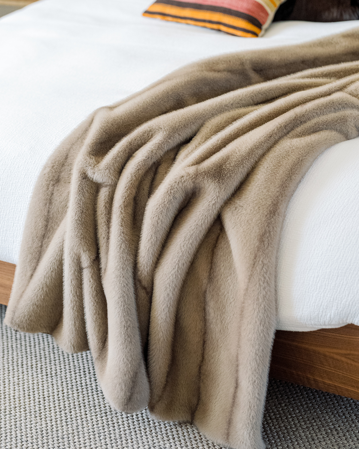 Think like an interior designer and transform a living area, bedroom, or study with a Vintage Mink Throw. Sumptuously soft, just stroking this luscious medium-weight fur slows the breath and soothes the soul. Toss a Vintage Mink throw over a sofa back or the foot of a bed and sense the welcoming warmth and elevated ambiance. Invite the dog, call the cat, and let the kids snack because our Vintage Mink throw is easy-care machine wash/line dry.