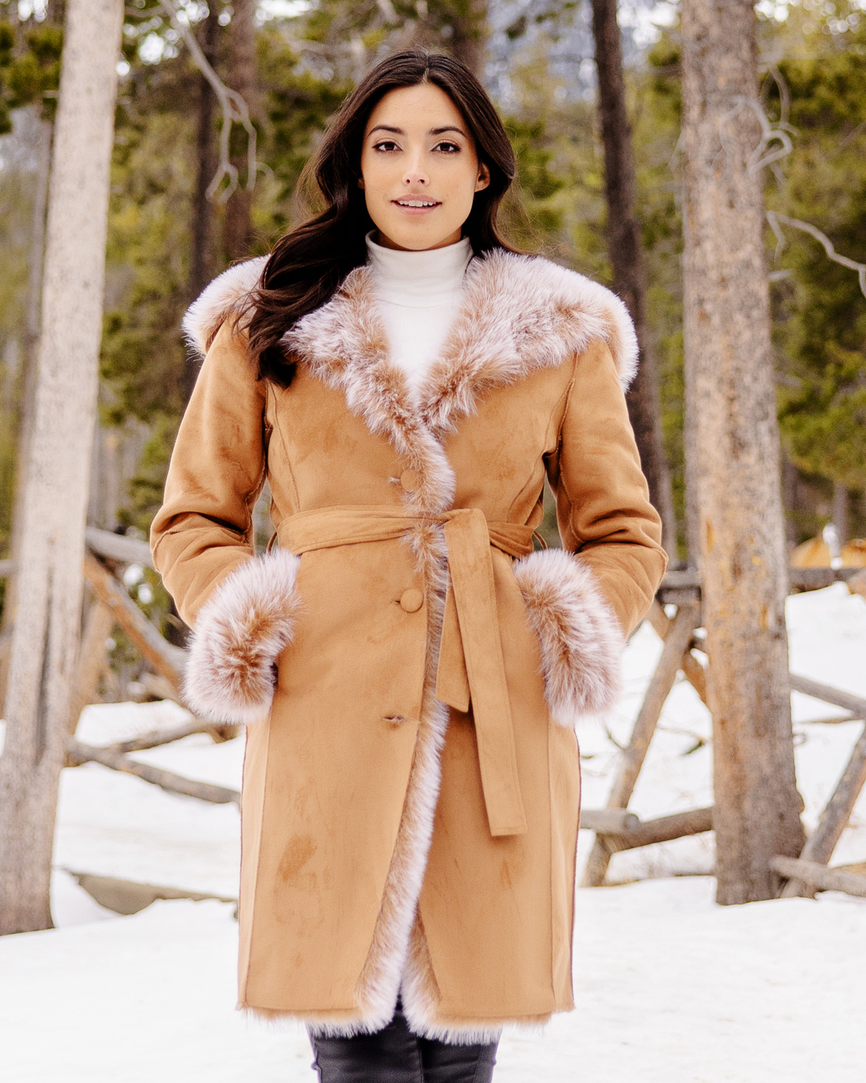 The coat you thought resided only in your dreams? It’s the Sundown Suede belted coat! With rich Toffee vegan suede outside and lush, lightly tipped Espresso Fox inside, this 38” stroller is dream-worthy. The generous fur-lined hood transitions into an oversized collar and the fur spill along the center front add flattering verticality. The tie belt can be tied in front or casually knotted in back. Rollup fur cuffs adjust to a custom length and its knee-length makes it ideal for walking. Fabulously flattering and wondrously warm, the Sundown Suede has the dreamy bonus of easy-care machine wash/line dry.