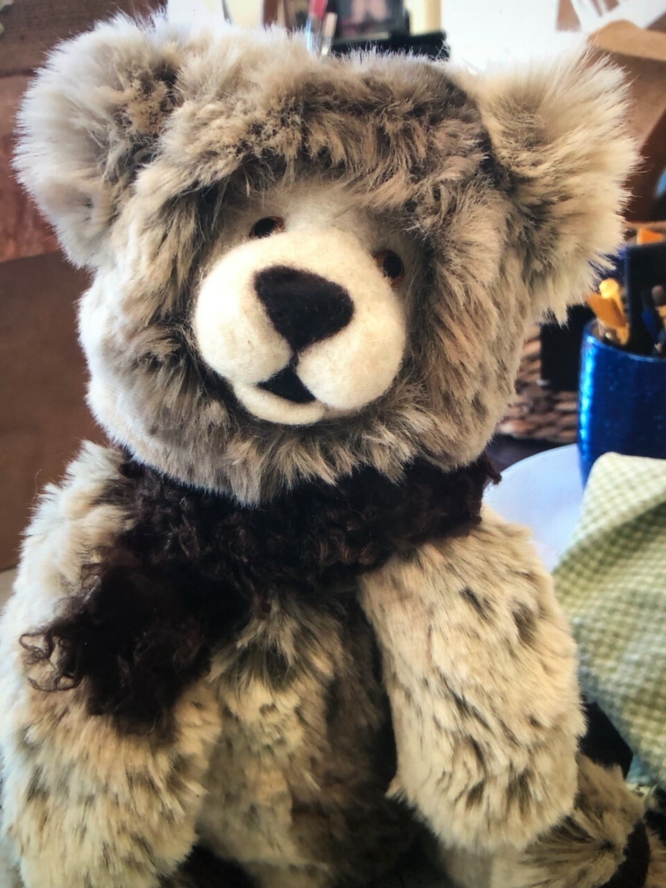 Bears are just one of Barbara’s voluntary creative endeavors. During Covid, she delighted the ladies in a local nursing home with ‘fur sleeves’ she created from Fabulous-Furs scraps. Extending from wrist to elbow, Barbara’s creations warmed cold hands caused by poor circulation, while providing tactile comfort. Ever the artist, she made them glamorous and fun with pearl and rhinestone embellishment.