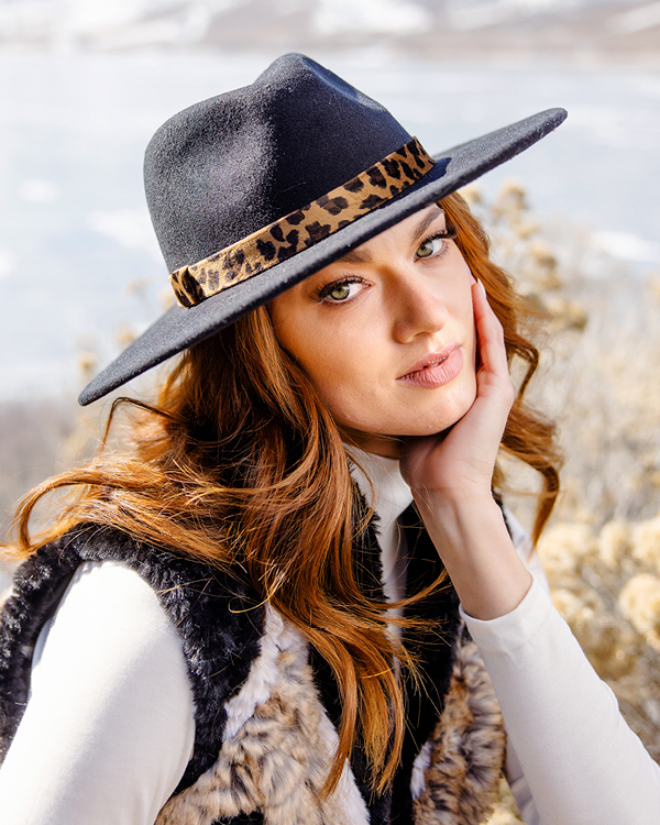 Whether you’re headed to Churchill Downs or throwing a Derby-inspired party at home, our Fedora is the perfect hat choice. With a classic pinched crown and shaped to cast flattering shadows, the flat brim magically erases hints of late nights, too much fun and too little sleep. In Black or Leopard, a narrow band encircling the crown, adds design interest, texture, and color. Inside, a concealed ribbon tie ensures adjustable custom fit.