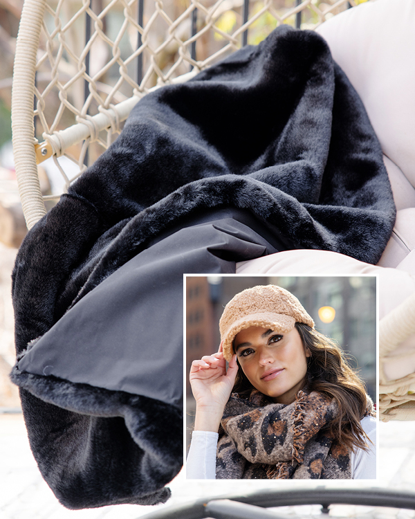 Perfect for cheering at track meets and spring soccer games, our 42" x 30" Mink Lap Blanket has soft, cozy black sheared mink on one side and black weather-resistant fabric on the reverse. Use it to cushion stadium seating OR grassy sidelines. Complete with a 13" x 13½" drawstring carrier of weather-resistant fabric. In yet another season, the Mink Lap Blanket takes you comfortably to outdoor concerts, picnics, and alfresco dining. Life happens and, conveniently, the Mink Lap Blanket is easy-care machine wash/line dry. Don’t forget our cute Sherpa Baseball Hat. Large enough to shade your eyes, the 3"-deep bill is perfect for hiding the fact you’ve ventured out with no makeup.