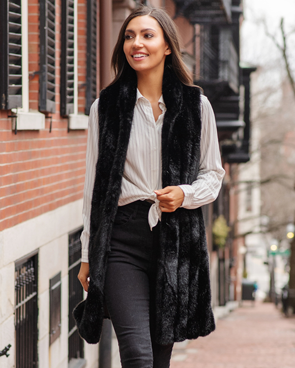 It’s no secret that I love a vest for spring! With it’s figure flattering cut and length and “goes-with-everything” faux black mink, this is a more elevated version of my favorite layering piece that’s perfect for both the office and cocktails!