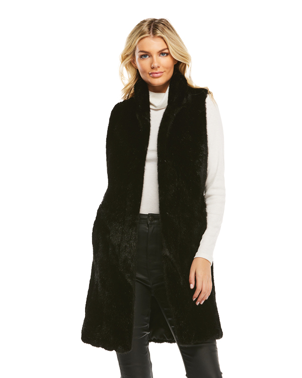 Bring the drama in pelted faux black mink. The longer length makes this vest far from basic. Pair with your favorite jeans for an easy night-out look or with leggings and a hoodie for a slightly elevated coffee run.