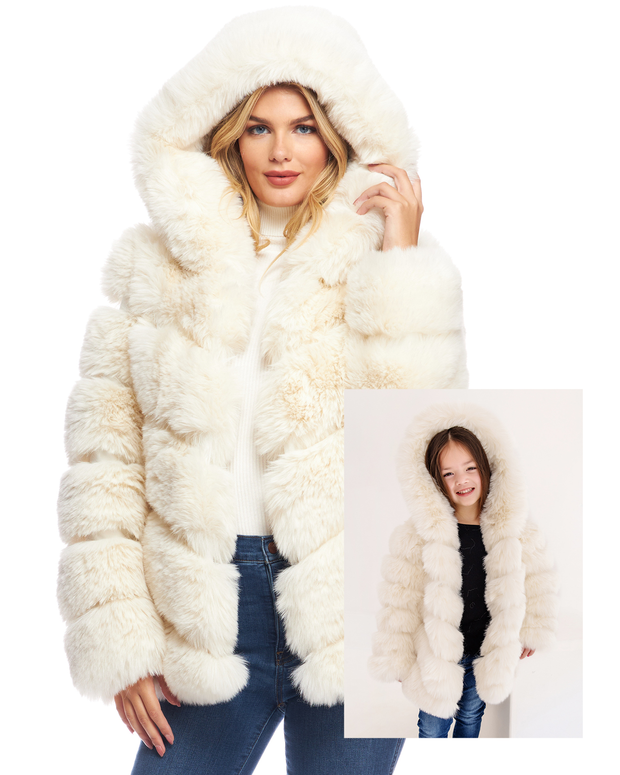 From school days to snow days, you’ll both be winter ready in these ultra-warm hooded styles. A subtle chevron pattern replaces pelt lines to add an eye-catching detail to the chic, faux ivory fox. Both feature hidden hook and ring closures creating a smooth silhouette, but still maintaining the cuddly appearance that make both looks so adorable.