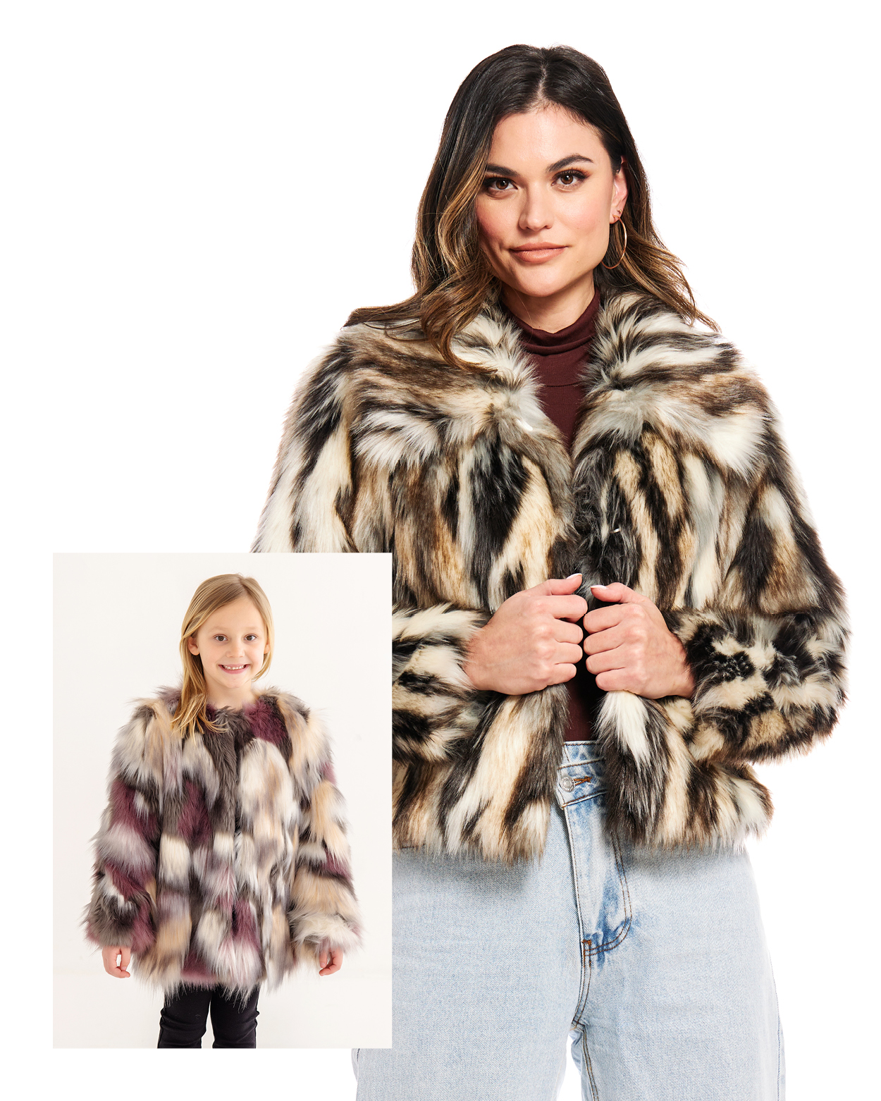 For the girls with a little extra personality who don’t mind being a tad bit “extra,” these fun, abstractly patterned styles are the perfect fit. Both are made of a longer faux fox fur with a beautiful texture that’s also soooo soft. The neutral, abstract pattern of the Desert Dream Jacket is given a youthful spin with touches of purple for your favorite little one.