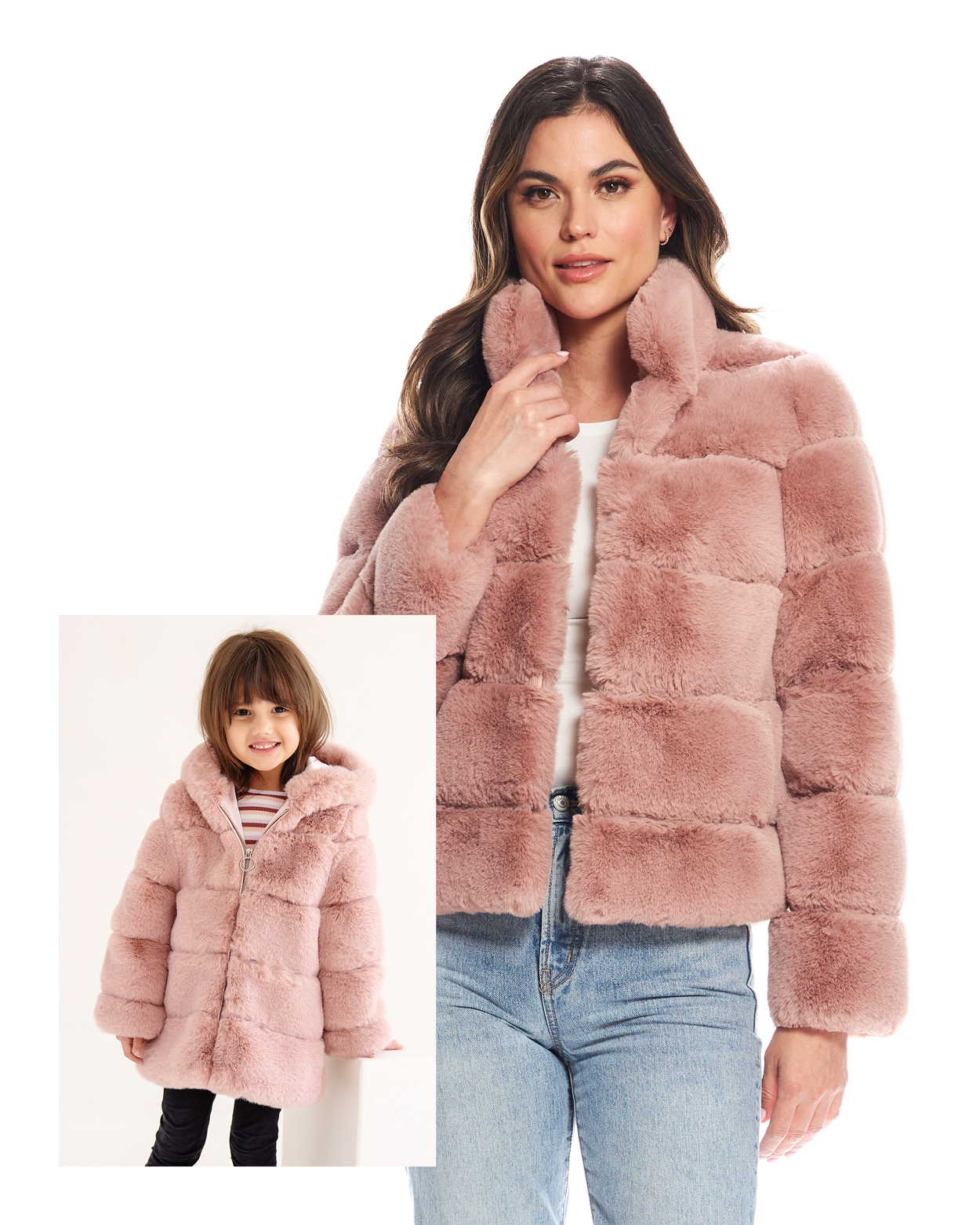A Perfect Parka and Posh make the Perfect Pair (Try to say that 3 times ). Tongue twisters aside, these rosy styles make for an adorable duo. Our kids Perfect Little Parka is aptly named thanks to its hood, easy zip closure, slightly longer length and (of course) our signature soft faux fur. The Posh Jacket is a more grown-up version in a shorter silhouette and face-framing stand up collar.