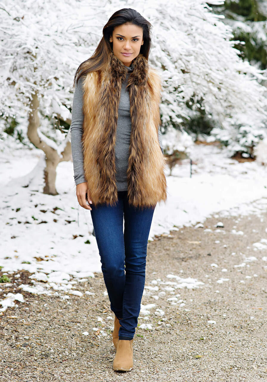 Fox, arguably nature's most beautiful fur, has an equally beautiful faux counterpart: Red Fox! A visually graphic feast of color, texture and toning, Red Fox is a celebration of warm Coppers and Rusts, softened by Tawny Tans and Brown and further enhanced with subtle Ivory and Tan tipping. A subtle vertical pattern gives this luxe, lush, highly-authentic fur the illusion of flattering length. Amazing to look at, but even better to wear, you'll fall in love with the fluid, flowing hand and whisper-soft touch of Red Fox. Pair it with a warm turtleneck, jeans and boots for brisk fall walks; dress it up with a silk shirt and velvet pants for a romantic dinner. Finished with hook & ring closures, this 26" classic vest will quickly become a three-season wardrobe staple.