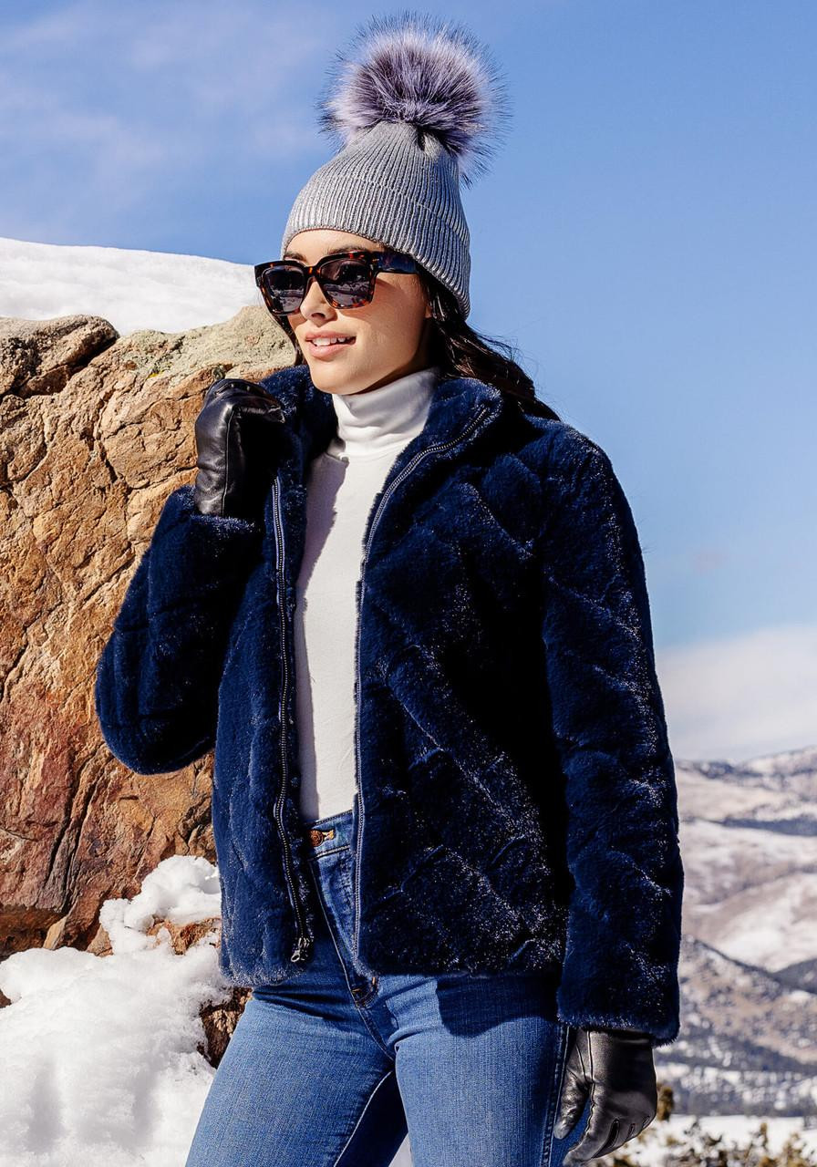 The Paige Zip Jacket is the cold-weather equivalent of your beloved designer jeans. In Navy sheared Mink, embossed with a subtle diamond-quilt pattern, Paige has that secret something that signals great taste. Soft and fluid as well, her standup collar lies open and flat. The front zipper closure, with double zipper guards, extends to the collar top for hem-to-chin warmth. With a body-skimming cut, the flattering 25" hip-length provides elongating coverage. Convenient forward front pockets disappear in the lush fur. Paige is that versatile wear-every-day, everywhere-style that's both ageless and timeless. Like your trusted and true favorite jeans, Paige refreshes with machine wash/line dry.