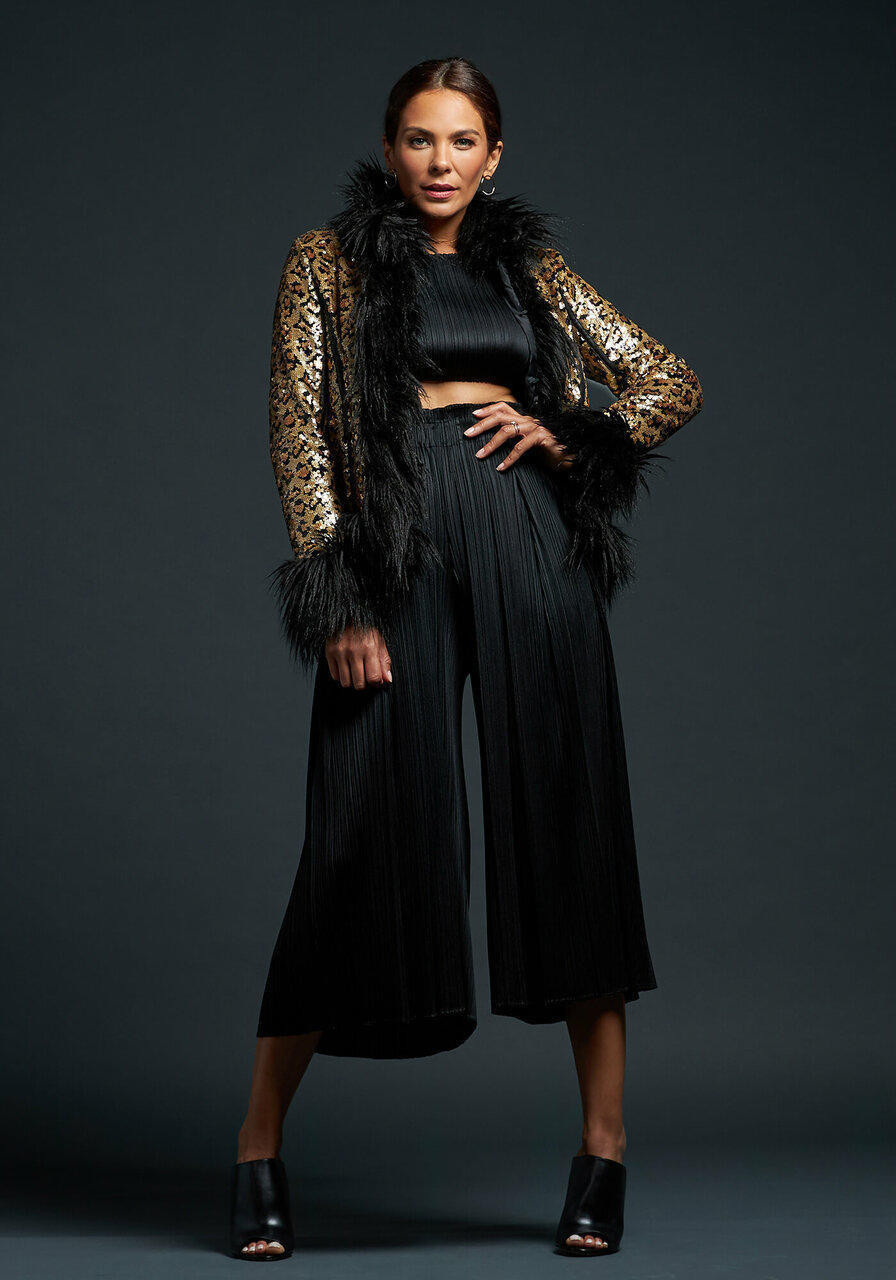 If sequins and racing stripes perfectly match your wry fashion sense, our "Gold-Digger" jacket is YOU! And if liquid sequins exist, they live in the subtle Leopard spots on this amazingly supple and soft 24" jacket. On a soft Champagne Gold ground, Black spots are ironically juxtaposed with graphic Black leather--vegan, naturally--emphasizing  body-skimming princess seams, both front and back. Black Tibetan Lamb trims the center fronts, hem and sleeves edges and is repeated on the face-framing standup collar. With hook & ring closures, fronts meet rather than lap for a bulk-free body-conscious silhouette. Pockets concealed in front princess seams further ensure a sleek look. The fun little jacket you'll wear with confidence to the stuffiest black tie event, is also perfect with dark denim and boots for drinks and dinner at that casual new bistro.