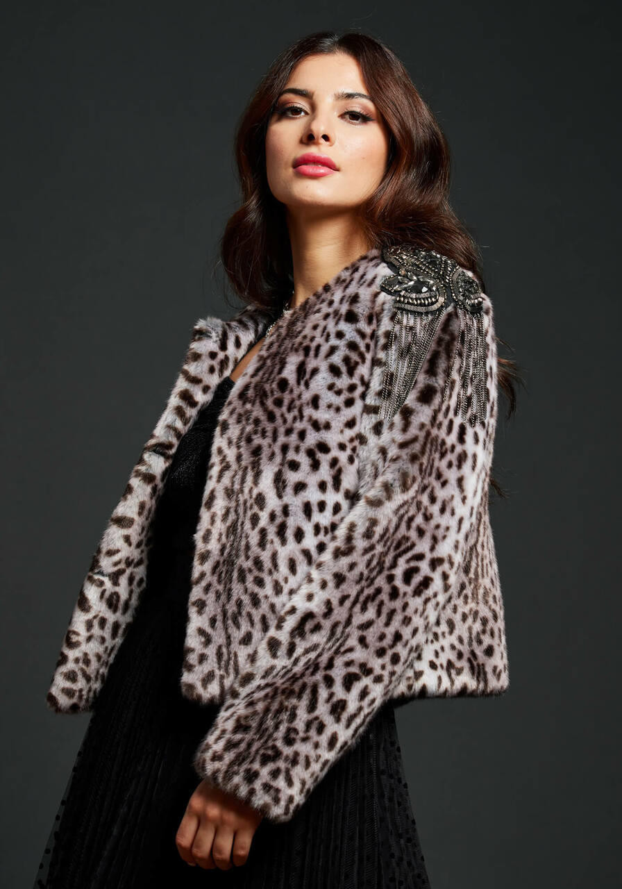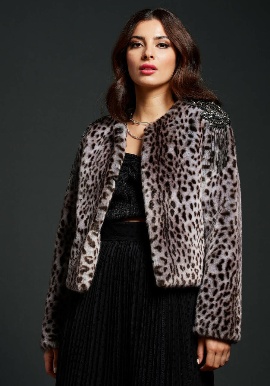 You're right! You'll be fabulous in the Tough Lux Leopard! Matching your avant-garde fashion sense, the Tough Lux embraces the most important elements of design. The incredibly soft Dove Grey Leopard balances the unexpected irony of metallic beaded epaulets, complete with oversize clear crystals AND chain metal fringe. Concealed pockets and fur hooks disappear into the sumptuous pile that happens to be lush and fluid. Sheared and compact, the suble Grey Leopard pattern plays perfectly with the clean, modern 20" silhouette. Paired with tall boots and liquid vegan leather leggings OR your favorite LBD, you'll be a fabulous Yin and Yang combination indeed!