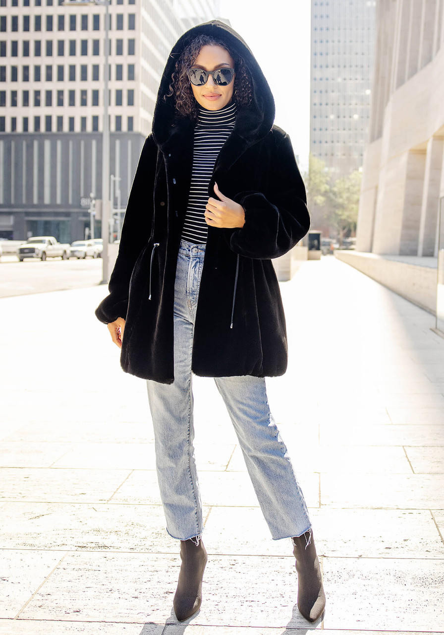 The quintessential anorak, packed with panache and style, will first draw you in with super soft Black Sheared Beaver. Sleek and slimming, Black Sheared Beaver is lusciously warm yet fluid enough to handle classic anorak styling. From the fur-lined hood and European fur hook closures to concealed velvet pockets and bubble sleeves, we incorporated every luxurious design detail available. More than luxuriously styled, our 31" hooded anorak is endlessly wearable AND flattering as well. You'll cinch the waistline drawstring just so, marveling at your lean reflection as you pass a full-length mirror. Then out the door to work, for dinner with friends or an evening winter walk, congratulating yourself on choosing an anorak that does it all!
