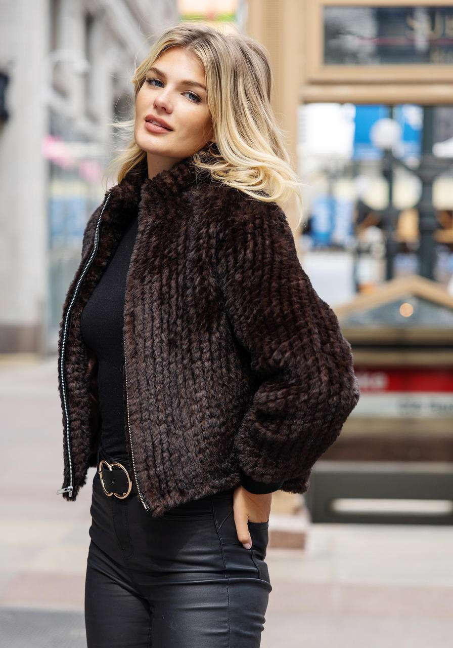 The Fifth Avenue Knitted Fur Bomber is the fur jacket dreams are made of! In rich Whiskey Brown, the hand-knitted fur alone is a fantasy of color, softness and light! With rich dark tipping and a lighter undercoat, the ultra-soft touch and fluid hand can't be real! Is the sublime composition of color and texture merely an illusion? No darling--that dynamic knit pattern is what makes the 22" Fifth Avenue Knitted Fur Bomber so liquidly fluid! And the Gold zipper extending to the upper edge of the standup collar is the dream detail you'll love in real time. Ribbing finishes the sleeves; concealed elastic ensures a body-skimming fit, while pockets disappear into the luxe pile. Indeed, the Fifth Avenue Knitted Fur Bomber IS a dreamy aspiration.